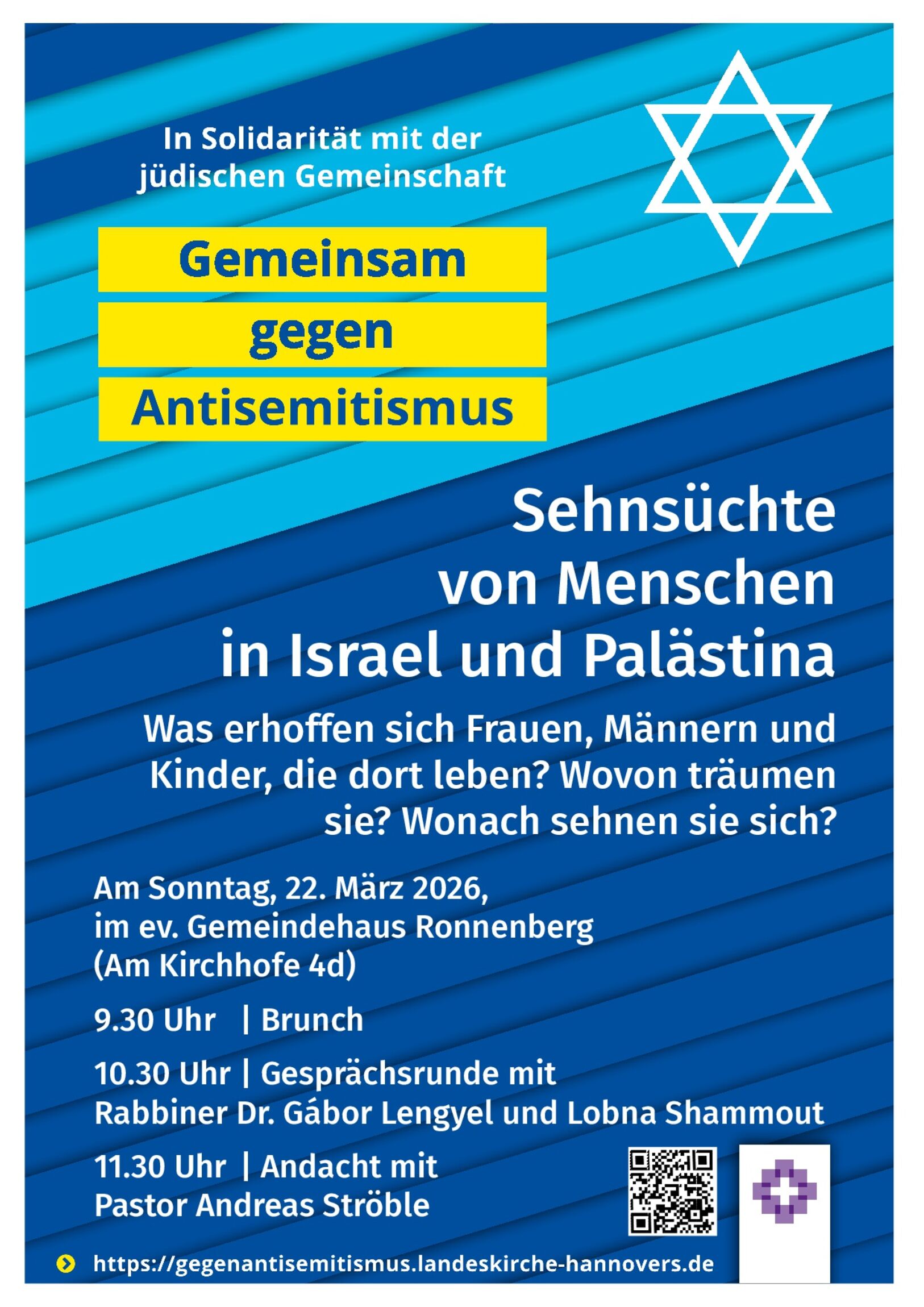 Die Gesprächsrunde mit Rabbiner Dr. Gábor Lengyel und Lobna Shammout wird von einem gemeinsamen Brunch im Vorfeld sowie einer abschließenden Andacht begleitet.