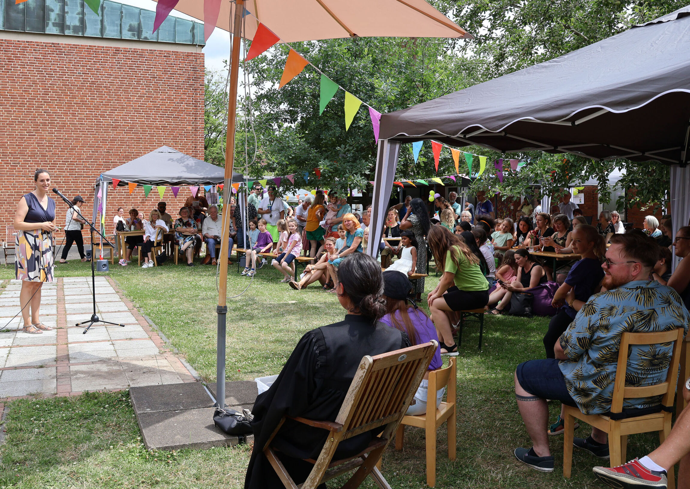 "Gott mag Feste und Gott feiert mit" - davon sind Handpuppe Lucy und Pastorin Rebecca Schoppe überzeugt. Mit ihrer Andacht begann am Sonntag, 29. Juni, das große Sommerfest zum 15-jährigen Bestehen des Familienzentrums in der Johanneskirchengemeinde in Empelde. Auf dem Platz vor der Kirche, im Innenhof und den Räumen des Familienzentrums feierten alle Generationen gemeinsam und fröhlich.