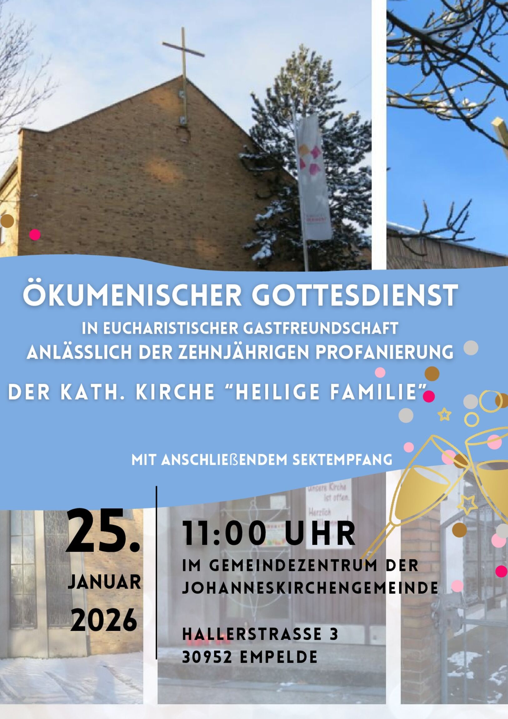 Am Sonntag, den 25. Januar 2026 findet um 11 Uhr ein ökumenischer Gottesdienst anläßlich der zehnjährigen Profanierung der katholischen Kirche "Heilige Familie" mit anschließendem Sektempfang im Gemeindezentrum der Johanneskirche Empelde statt.